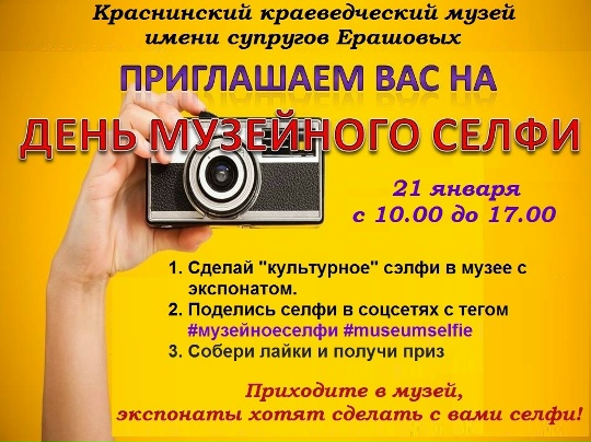 Где можно сделать самое неординарное и креативное селфи? Конечно же в музее! Приглашаем присоединиться к популярной международной акции «День музейного селфи», которая проводится ежегодно в третью среду января. В этом году акция состоится 21 января. Принять участие в ней может любой желающий.