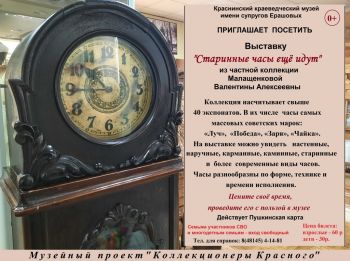 В рамках музейного проекта " Коллекционеры Красного" в музее с 23 декабря начнёт  свою работу выставка часов из частной коллекции жительницы Краснинского округа Малащенковой Валентины Алексеевны.