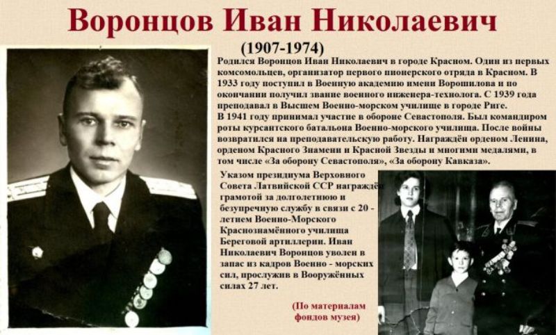 Также для юных посетителей была подготовлена фондовая выставка об уроженце посёлка Красный, организаторе первого пионерского отряда при Краснинской школе в 1924 году, Воронцове Иване Николаевиче, принимавшем участие в героической обороне Севастополя в 1941 году во время Великой Отечественной войны.