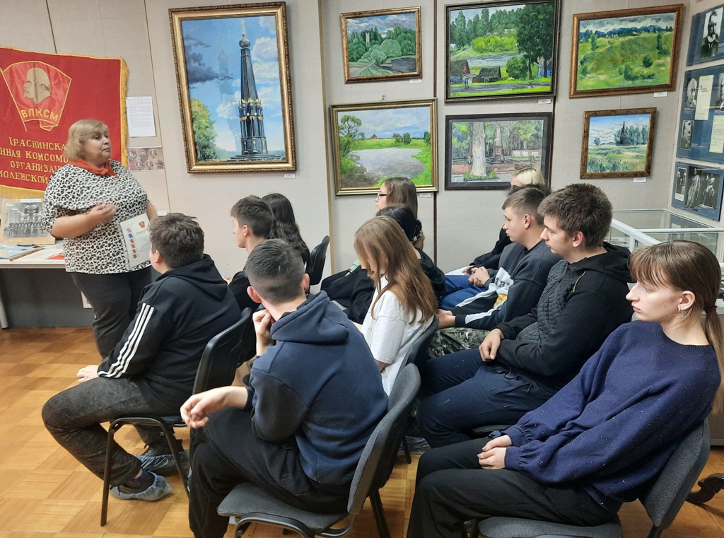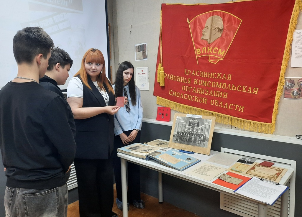 На На мероприятии присутствовали обучающиеся 9В класса Краснинской средней школы (классный руководитель Кабычкина Ирина Евгеньевна) В начале мероприятия старшеклассники окунулась в комсомольскую молодость, послушав песни о комсомоле.Научный сотрудник музея рассказала об истории комсомола и его роли в жизни страны, о значимых достижениях, и подвигах комсомольцев С большим интересом молодежь рассматривала комсомольские атрибуты: комсомольские билеты, значки, знамя. Также школьники посмотрели фоторолик и выставку о комсомольском движении в Краснинском районе по материалам из фондов музея