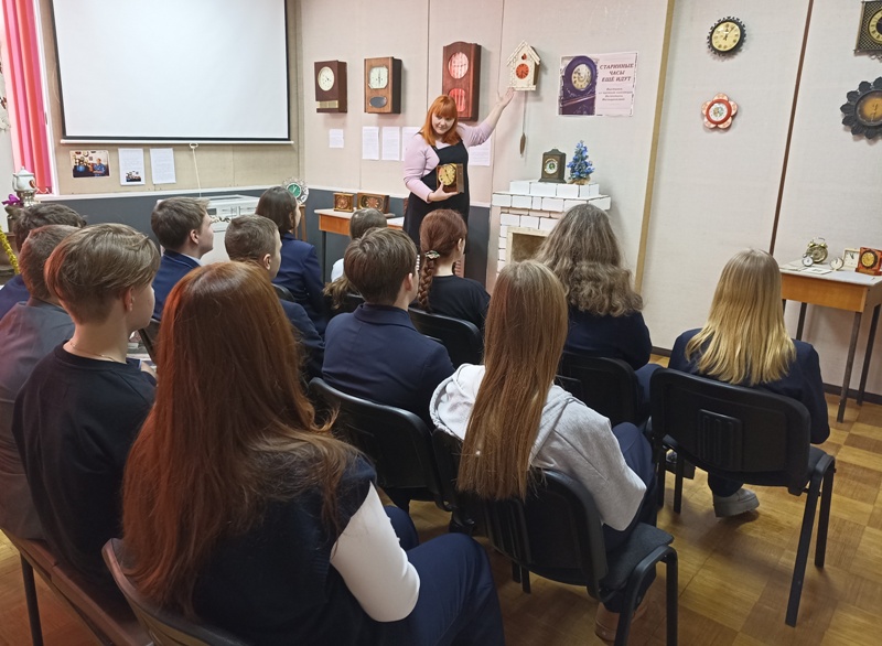 Ребята ознакомились с разнообразием часов, их видами, моделями, названиями заводов изготовителей советского периода. Узнали, как менялись представления о времени на протяжении веков, какие виды часов существовали в разные эпохи, как они работали и, как устроены. Участники мероприятия отгадывали загадки, дополняли пословицы о времени, отвечали на вопросы викторины. В заключение ребята пришли к выводу, что время необходимо беречь, причём не только своё, но и чужое, каждый миг единственен, потому что он уже никогда не повторится. Для посещения экспозиции экскурсанты воспользовались Пушкинской картой.